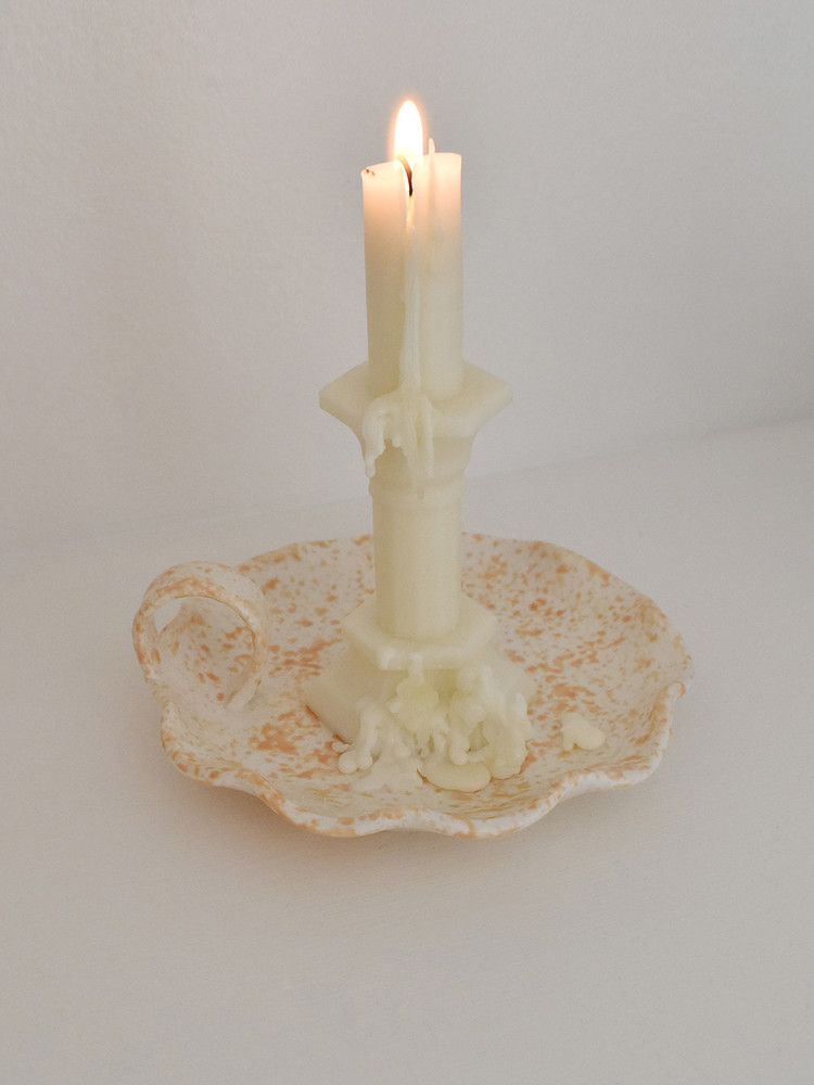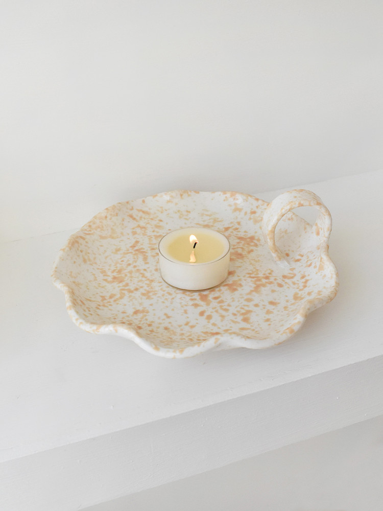 スポンジにカラー釉薬を塗ってポンポンと叩いて不規則なパターンを作り、取っ手をつけてキャンドルに火をつけた時も安全に移動できるようにデザインしました。